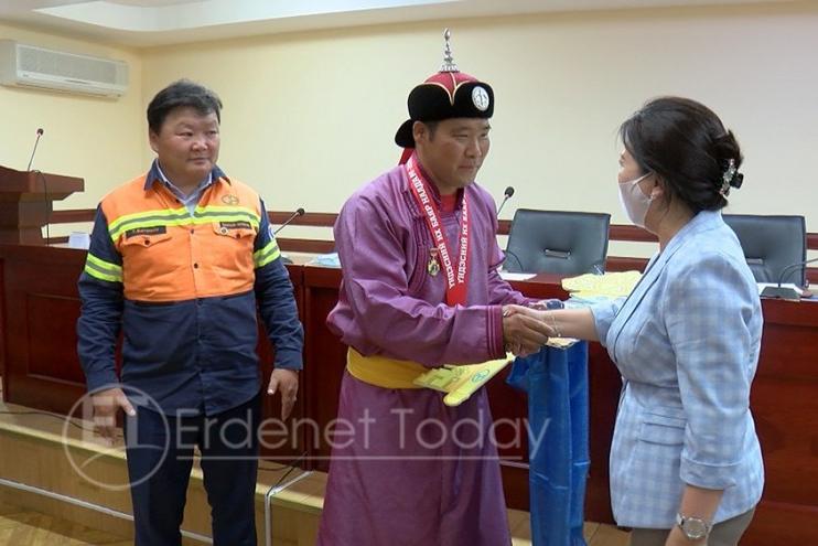 “Эрдэнэт үйлдвэр” ТӨҮГ-ын Ерөнхий захирал Х.Бадамсүрэн тушаал гаргаж, Ардын хувьсгалын 99 жилийн ойн их баяр наадмын үндэсний сурын харваанд түрүүлэн, Монгол Улсын Даян мэргэн цол хүртсэн Хангарьд спорт клубын тамирчин Д.Дэмбэрэлсайханыг хоёр өрөө орон сууцаар шагнаж, урамшууллаа. Байрны түлхүүр, батламжийг өнөөдөр тус үйлдвэрийн удирдлагуудын шуурхай зөвлөгөөний эхэнд Ерөнхий захирлын Нэгдүгээр орлогч бөгөөд Ерөнхий инженер Т.Батмөнх, Санхүү эдийн засаг хариуцсан орлогч Д.Үүрийнтуяа болон албаны бусад хүмүүс баяр хүргэж, гардуулав.